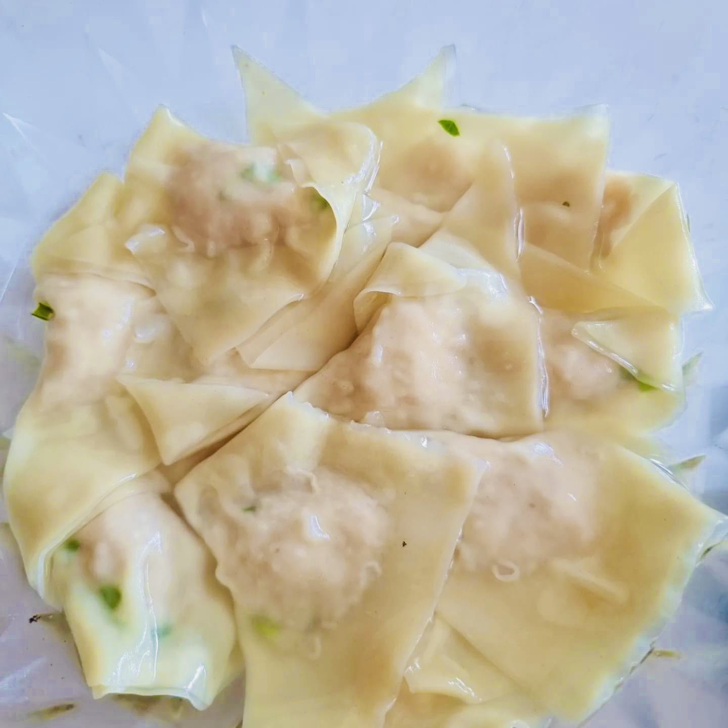 2. ห่อไก่บด ในแผ่นเกี๊ยว ทำเป็นแผ่น3 เหลี่ยมห่อเสร็จใส่ตู้เย็นพักไว้ 30 นาที