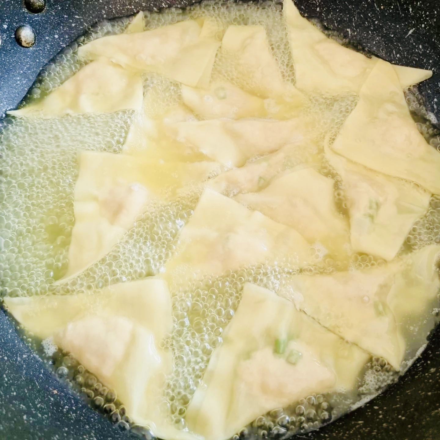 6. ใส่แผ่นเกี๊ยวในน้ำ กลับด้านแผ่นเกี๊ยวให้สุกทั่ว